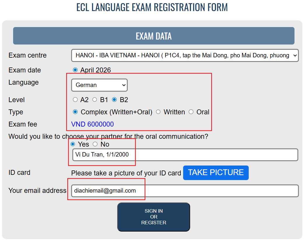Minh họa 1: Chọn ngôn ngữ, trình độ, hình thức thi, Partner và điền E-Mail