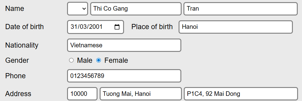 - Điền đầy đủ, chính xác thông tin cá nhân, đặc biệt chú ý họ, tên đệm và tên (VD: tên đầy đủ là Trần Thị Cố Gắng thì điền ở mục “first name” là "Thi Co Gang", ở mục “last name” là “Tran”), điền “31/03/2001” tức là sinh ngày 31, tháng 03, năm 2001, ở mục “Postal code” có thể tìm trên Google mã bưu chính chung của tỉnh/thành phố hiện đang sinh sống (VD: postal code Hanoi), điền ngắn gọn địa chỉ theo quy định sau sáp nhập (xem Minh họa 2).