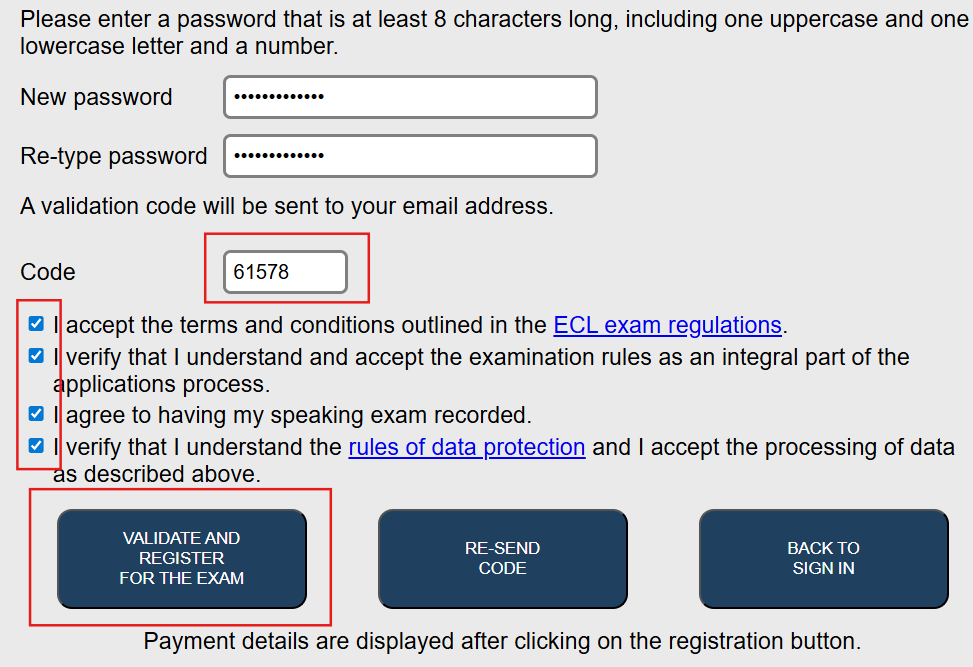 - Tạo mật khẩu phục vụ cho việc xác thực E-Mail. Mật khẩu cần có tối thiểu 8 ký tự, có cả chữ thường, chữ in hoa và số. Sau đó, bấm vào “SEND CODE” để nhận mã xác thực (validation code) về E-Mail (bấm vào “RE-SEND CODE” nếu chưa nhận được validation code, chú ý kiểm tra cả mục Spam/Thư rác). Điền mã xác thực đó vào mục “Code”, bấm tích các điều kiện phía dưới và chọn “VALIDATE AND REGISTER FOR THE EXAM”.