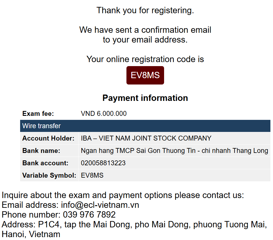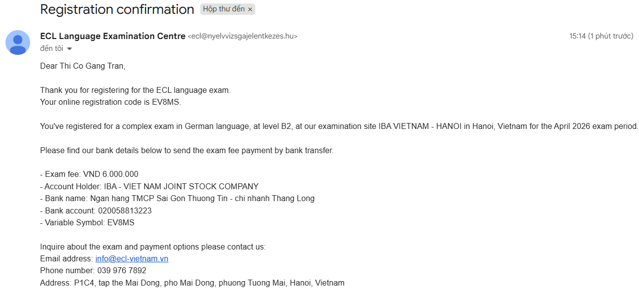 Trong vòng 72 tiếng kể từ thời điểm chuyển khoản lệ phí thi (không tính thời gian ngoài giờ làm việc, cuối tuần, nghỉ lễ), các bạn sẽ nhận được thêm một E-Mail từ ECL-Việt Nam thông báo rằng đã đăng ký thi thành công hoặc không thành công. Quá thời gian trên, nếu vẫn chưa nhận được bất kỳ thông báo nào, các bạn hãy liên hệ tới địa chỉ [email protected], gửi kèm ảnh chụp E-Mail có online registration code và ảnh chụp biên lai chuyển khoản để được hỗ trợ.